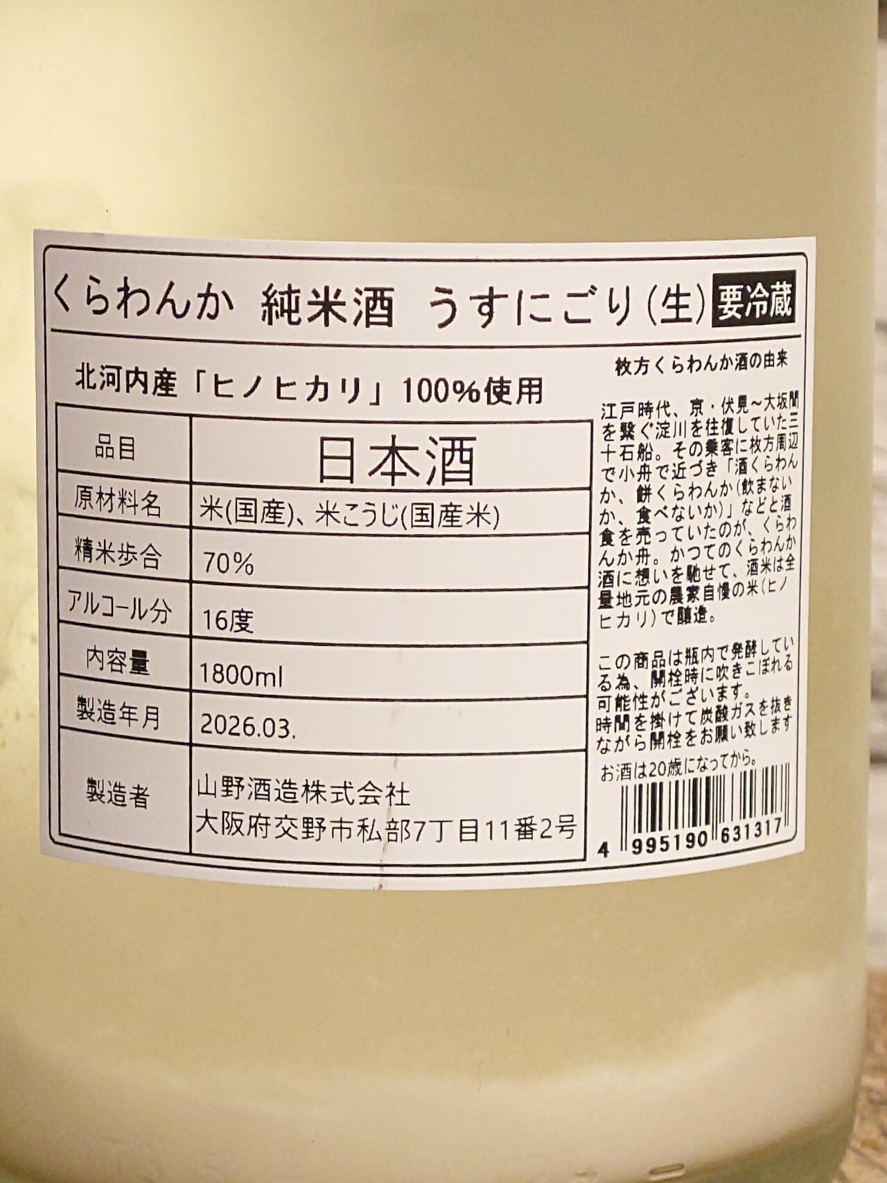 山野酒造(大阪府) 16度 ヒノヒカリ