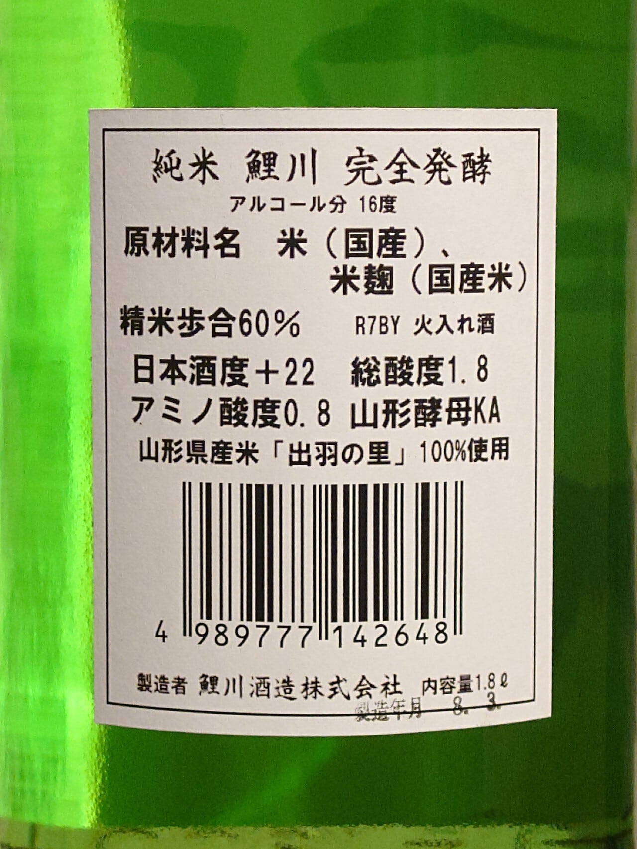 鯉川 純米 完全発酵 +22 R7BY 1.8L