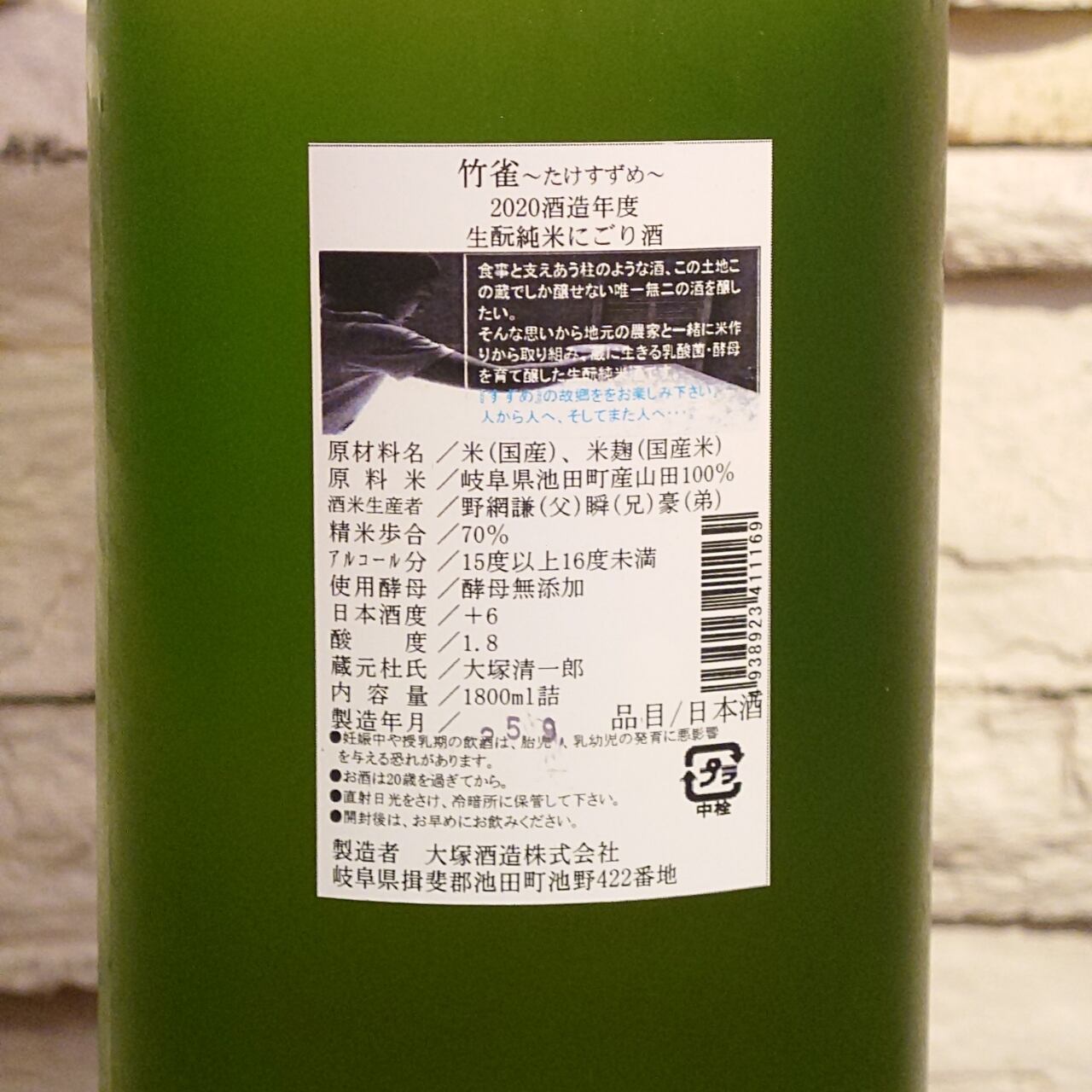 竹雀 生酛 純米 にごり酒 2020BY 1.8L